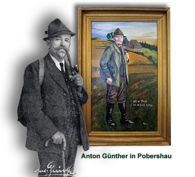 ...1936 war Anton Günther, wenige Tage vor seinem 60. Geburtstag und nur elf Monate vor seinem Tod noch einmal im Erzgebirge zu Gast. Auf Einladung des Erzgebirgsvereins nahm er von Pobershau aus auch an einer Sternwanderung zum Katzenstein teil. Willy Löschner, der 89-jährig im April 2010 verstorbene Pobershauer Mundartdichter war seinerzeit als gerade 16-Jähriger mit auf der Wanderung, bewunderte ein Leben lang Anton Günther und schrieb über den damaligen Besuch im Jahr 2001 sogar ein Gedicht. und veröffentlichte ein längst vergriffenes, leider nicht wieder aufgelegtes Gedichtbändchen „Drubm ofm Barg.” Das durfte natürlich in einer Anton-Günther-Ausstellung in Löschners Geburtsort nicht fehlen.
